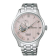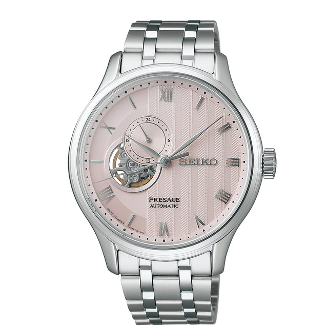 Crafted in Japan, the Presage “Japanese Garden” is an homage to the intricate yet uncluttered of the sand-pattern motif. Constructed in stainless steel, a complementing soft pink textured dial elevates the sophistication of this design. An open heart cutout reveals a window to the inner workings of the timepiece as it comes to life from the movement of your wrist.