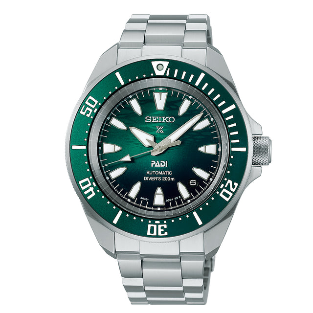 The Prospex SRPL53 is a refined expression of Seiko’s celebrated diving heritage, elevated with the modern innovation of mechanical technology. Designed to capture attention both above and below the surface and inspired by the "Samurai" case language, the thinner stainless steel design wears closer to the wrist, dropping the centre of gravity for a more comfortable feel. In collaboration with the PADI organization, the sophisticated green dial gives the illusion of looking up at the sky from beneath the waves. Oversized hands and markers, generously coated in LumiBrite, ensuring unmatched clarity in any light condition. Every detail reflects a seamless harmony of tradition and innovation, making the SRPL53 not just a tool for adventure, but a statement of style and sophistication.