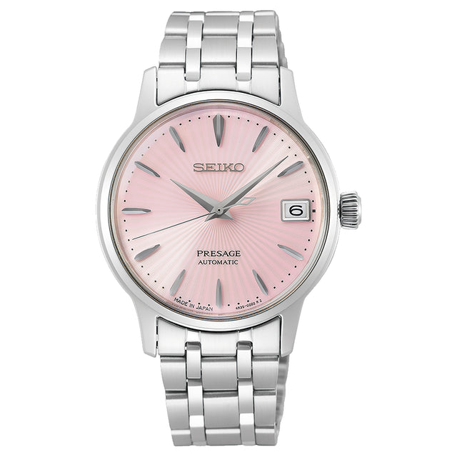 Crafted in Japan, the Presage “Cocktail Time” SRP839 embodies Seiko’s celebrated artistry and watchmaking mastery. Its polished stainless steel case houses a refined automatic movement with a dependable 40-hour power reserve, ensuring both precision and reliability. The soft pink dial exudes elegance, its layered gloss finish creating a sense of depth and radiance that transforms a classic design into something uniquely captivating. A timepiece that blends tradition with contemporary sophistication, it is as graceful as it is enduring.