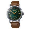 Seiko Presage Cocktail Time. Offering the finest in Japanese mechanical watchmaking, the Presage Collection blends precision technology with superior craftsmanship and design. Taking a more playful approach to the popular Cocktail theme line, this delightful watch is part of a group reflecting the casual charm of a vacation bar. Inspired by the Mojito cocktail, its gradated rich green dial features a pressed pattern reminiscent of the light reflected by a classic cocktail glass, as well as numerals styled to recall the printing on a vintage liquor label. The 23-jewel movement, with manual and automatic winding capability, beats at a frequency of 21,600 vibrations per hour, with a power reserve of approximately 41 hours. Crafted of stainless steel, this distinctive timepiece includes a calendar, box-shaped crystal, screwdown see-through caseback, smooth tan leather strap and tri-fold push button release clasp. 5 bar, 50M Water Resistant